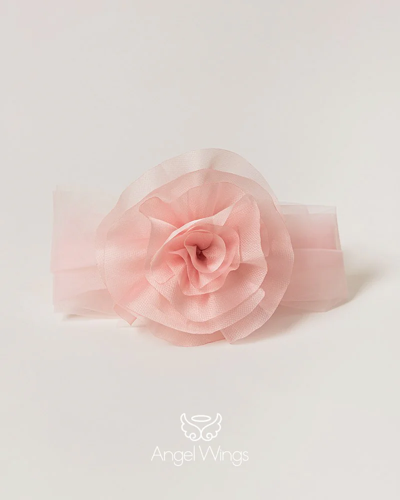 Το σύνολο ολοκληρώνεται με κορδέλα μαλλιών από τούλι, διακοσμημένη με ένα εντυπωσιακό oversize λουλούδι από σατινέ οργαντίνα στον ίδιο χρωματισμό με το φόρεμα, προσθέτοντας μια ιδιαίτερα κομψή και ρομαντική πινελιά.