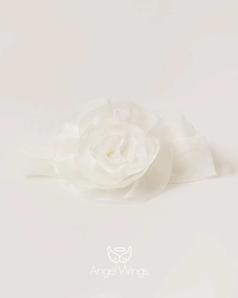 Το σύνολο ολοκληρώνεται με κορδέλα μαλλιών από τούλι, διακοσμημένη με ένα εντυπωσιακό oversize λουλούδι από σατινέ οργαντίνα στον ίδιο χρωματισμό με το φόρεμα, προσθέτοντας μια ιδιαίτερα κομψή και ρομαντική πινελιά.