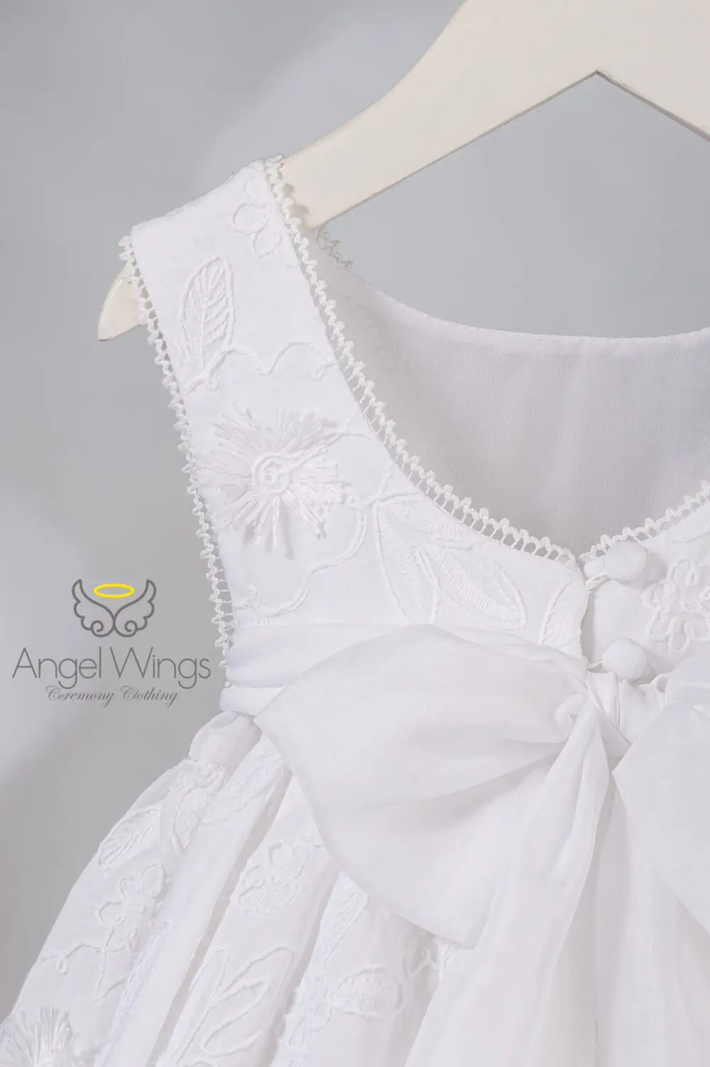 Το ιδιαίτερο διπλό μπούστο, που συνδυάζει αέρινη μουσελίνα με βαμβακερό κεντητό ύφασμα, δημιουργεί ένα εκλεπτυσμένο παιχνίδι διαφάνειας και υφών, χαρίζοντας βάθος και κομψότητα στο σχέδιο. Η φούστα σε γραμμή ομπρέλα, ενισχυμένη με φουρό, προσφέρει πλούσιο όγκο και υπέροχη κίνηση, δημιουργώντας μια παραμυθένια σιλουέτα.Η ζώνη από απαλή μουσελίνα δένει πίσω σε έναν ρομαντικό φιόγκο, ολοκληρώνοντας αρμονικά τη γραμμή του φορέματος και αναδεικνύοντας τη μέση με κομψότητα.