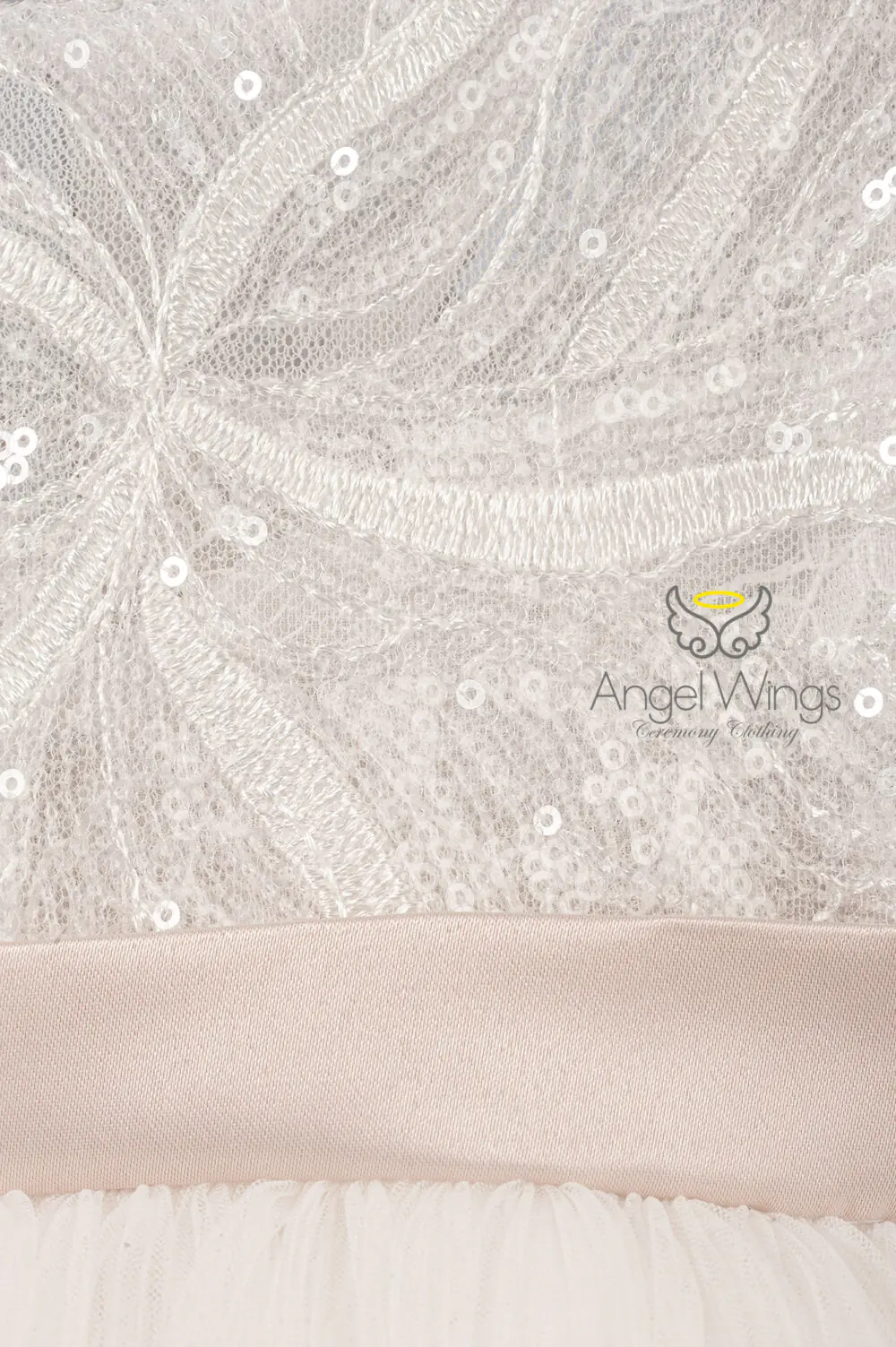 Η φούστα από πλισέ τούλι δημιουργεί πλούσια κίνηση και αέρινο όγκο, χαρίζοντας μια παραμυθένια αίσθηση σε κάθε βήμα. Το σύνολο ολοκληρώνεται αρμονικά με τούλινη κορδέλα μαλλιών, διακοσμημένη με εντυπωσιακό βολάν, φίνα λουλούδια και διακριτικά φτερά, προσθέτοντας μια ρομαντική και ιδιαίτερα κομψή πινελιά.