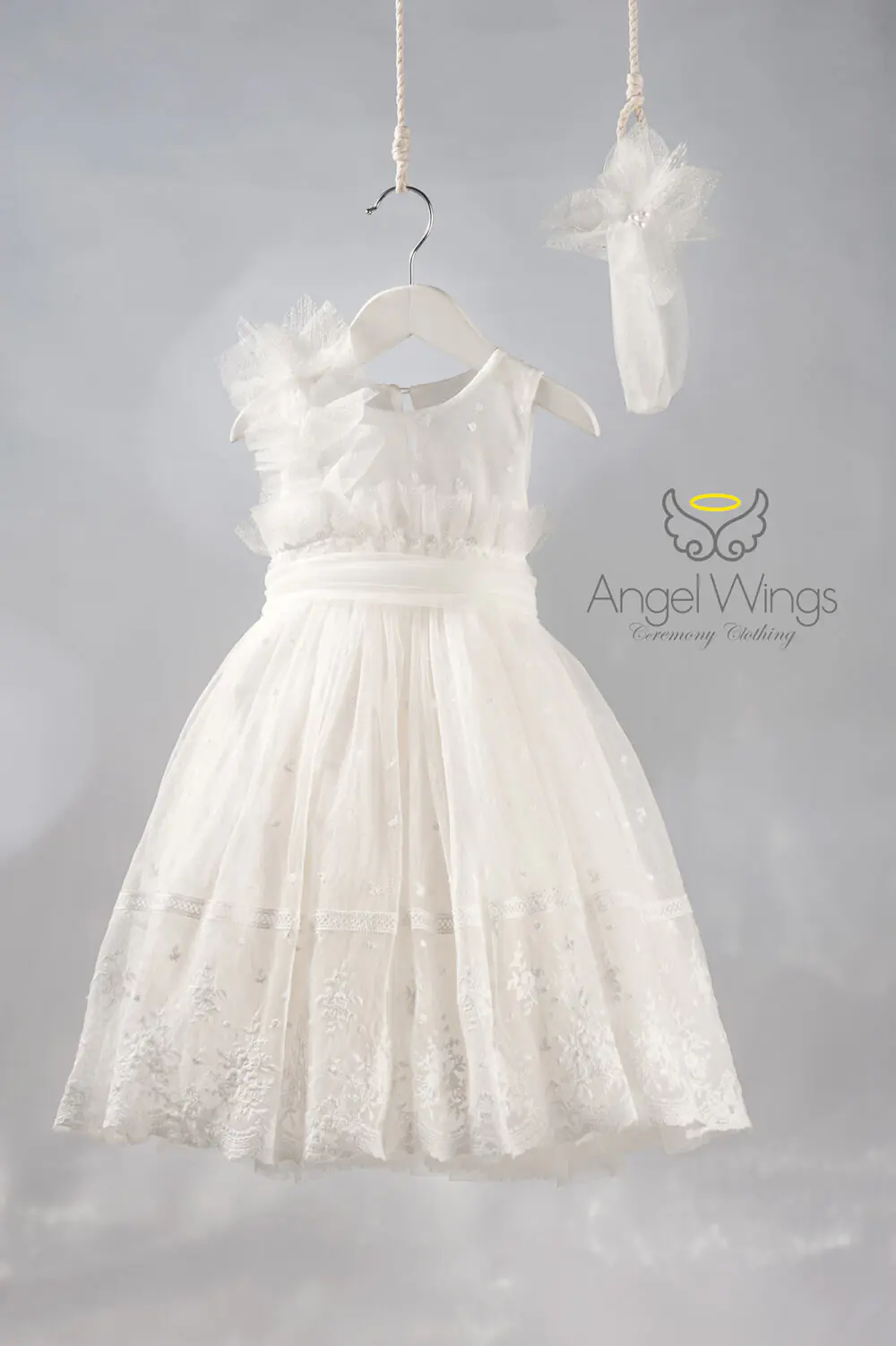 Το σύνολο ολοκληρώνεται αρμονικά με κορδέλα από τούλι στον ίδιο χρωματισμό, διακοσμημένη με ασορτί χειροποίητα λουλούδια και μαργαριτάρια, προσθέτοντας μια ρομαντική και παραμυθένια πινελιά.