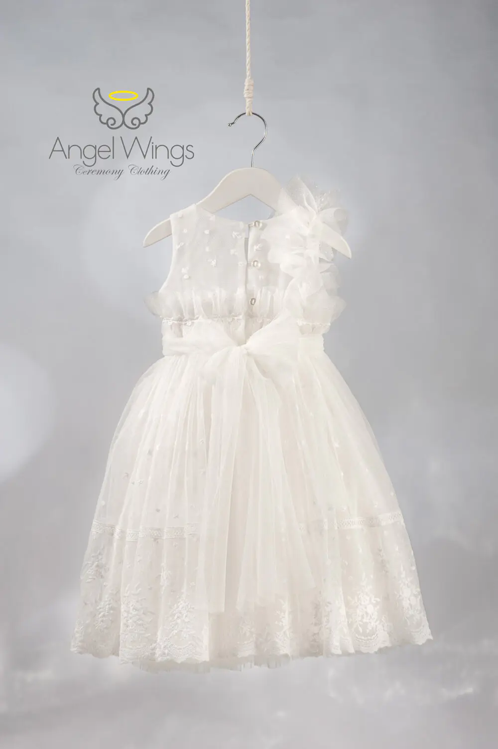 Ένα μοναδικά εντυπωσιακό μακρύ φόρεμα σε off-white απόχρωση, κατασκευασμένο από εκλεπτυσμένο κεντημένο τούλι με ρομαντικό τελείωμα από δαντέλα. Το μπούστο συνδυάζει κεντημένο τούλι με ντραπέ γκλίτερ πλισέ τούλι, δημιουργώντας μια λαμπερή και φίνα υφή.Στον έναν ώμο ξεχωρίζει ένα ασύμμετρο βολάν, διακοσμημένο με εντυπωσιακό χειροποίητο λουλούδι που χαρίζει μοναδική κομψότητα. Η ντραπέ ζώνη από τούλι αγκαλιάζει τη μέση, προσφέροντας τέλεια εφαρμογή και θηλυκή σιλουέτα.