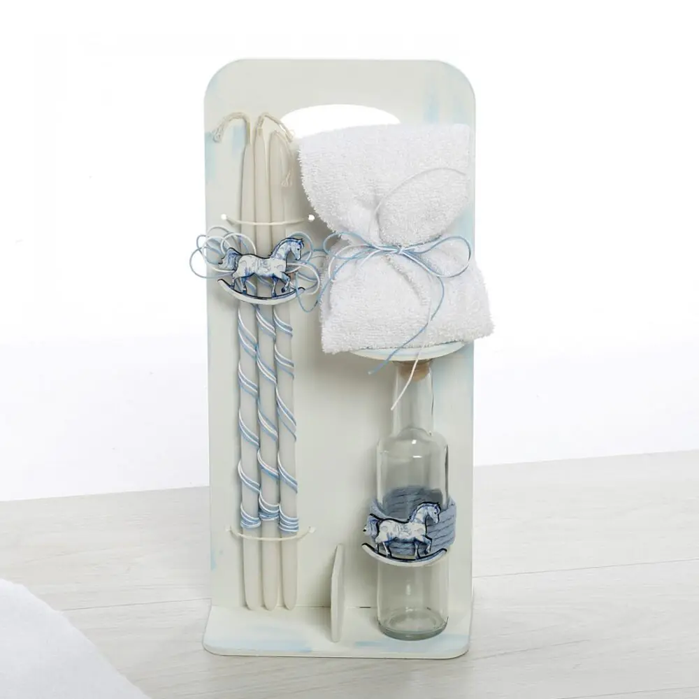 Σετ Λαδιού: Λευκό ξύλινο stand που περιλαμβάνει μπουκάλι λαδιού, σαπούνι και 3 κεράκια κολυμπήθρας, όλα ασορτί διακοσμημένα με γαλάζιες κορδέλες και μικρά vintage στοιχεία.