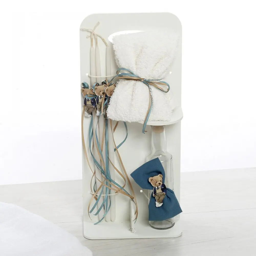 Σετ Λαδιού: Λευκό ξύλινο stand που περιλαμβάνει μπουκάλι λαδιού, σαπούνι και 3 κεράκια κολυμπήθρας, όλα ασορτί διακοσμημένα με μπλε κορδέλες και ξύλινη φιγούρα.